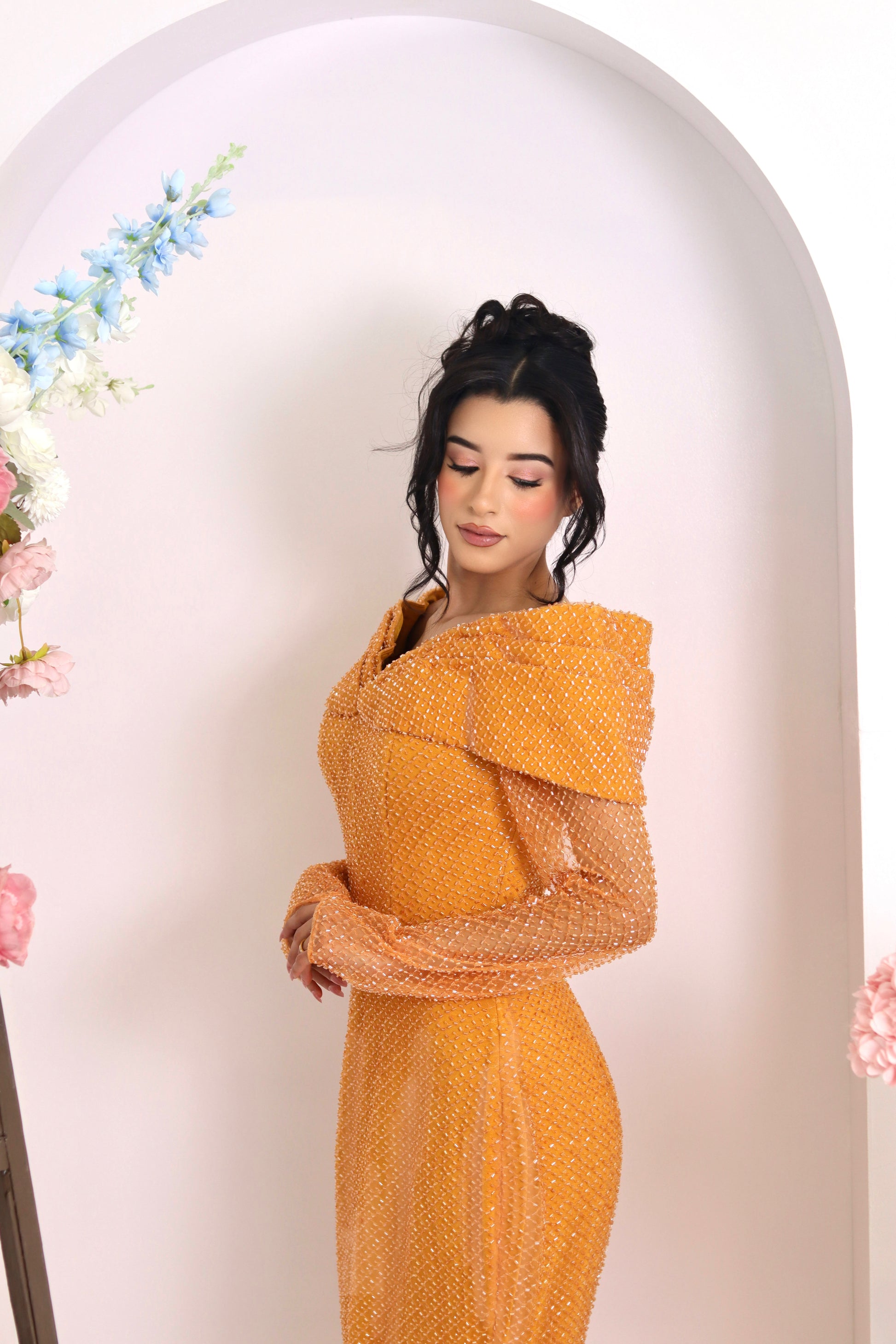 Bold, warm, and irresistibly striking, Honey glows in a rich shade of vibrant orange. Designed to turn heads, its defining feature is the stunning shoulder drapes that flow effortlessly, creating a regal silhouette and drawing attention upward with graceful movement.